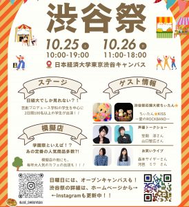 10/25(土)、10/26(日)に日本経済大学東京渋谷キャンパスで渋谷祭(学園祭)を開催いたします! 在校生のダンスステージやお笑いライブ、声優さんのトークショーなど盛りだ