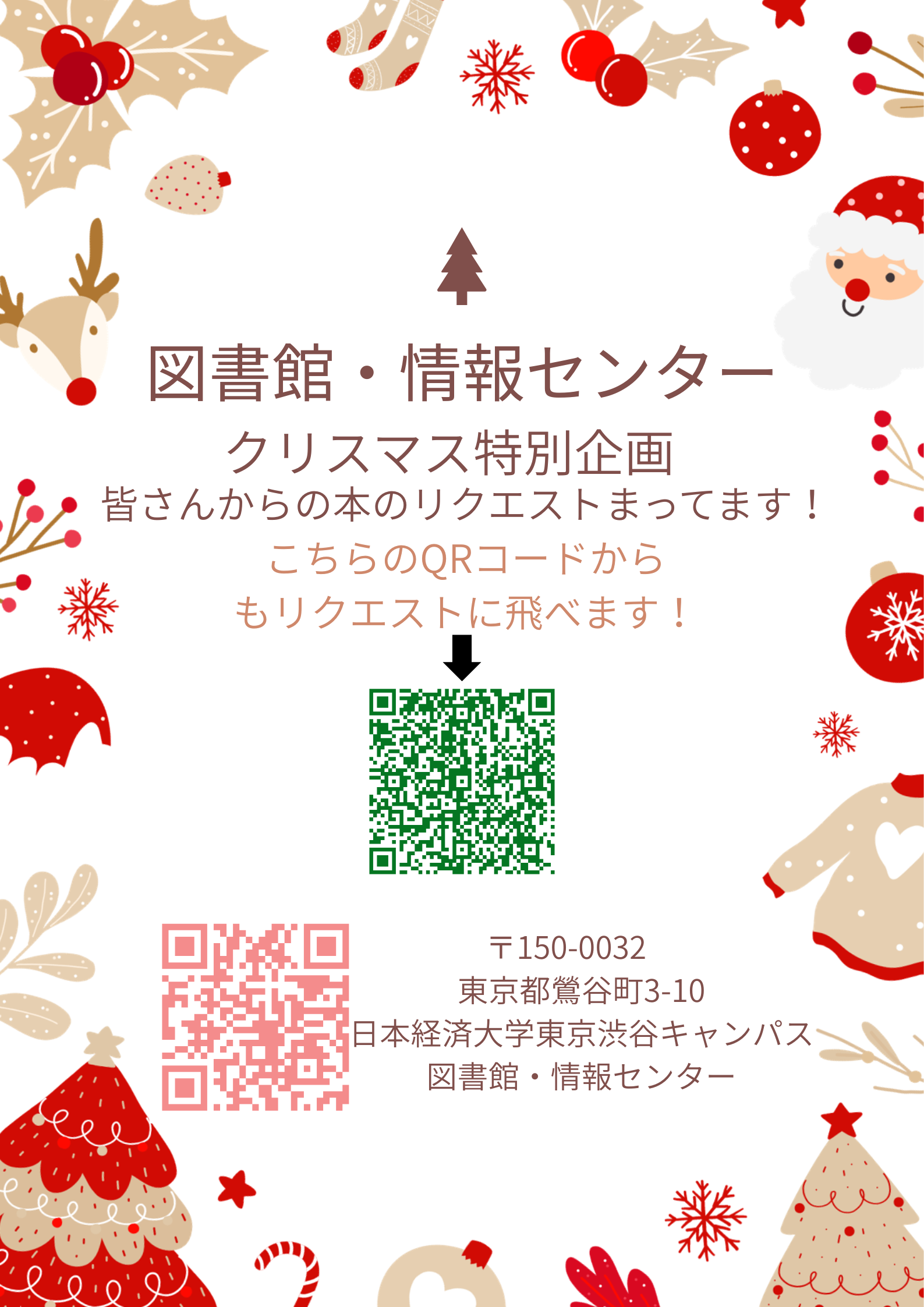 みなさん、こんにちは図書館・情報センターです😊 12月という事でクリスマス特別企画を行いたいと思います! 皆さんからの本のリクエストお待ちしております!! https://forms.office.com/r/nmQqpP7xN2