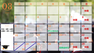 3月の休館日は、1,7,8,15,22,28,29日です!