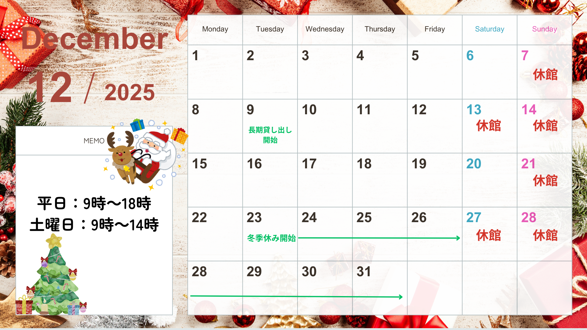 12月の休館日は、7,13,14,21,27,28日です! また、年内12月27日から年明け2026年度1月4日までは図書館・情報センターが休館となりますのでよろしくお願いいたします! みなさんのご来館お待ちしております😊