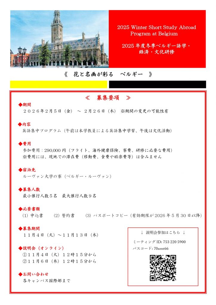 参加希望者はこちらの資料を確認のうえ、必ずオンライン説明会に参加してください。 ◆必要書類(オンライン説明会に参加後、応募するときに提出すること) ・申込書 ・誓約書 ・パスポートの顔写真・有効期限が載っているページのコピー ◆4年生の参加について 4年生でも参加は可能です。 ただし成績確定後の留学となりますので単位は付与されません。 <留学に関する問い合わせ先> 渋谷キャンパス国際部 03-3463-4143 / kokusaibu@tk.jue.ac.jp