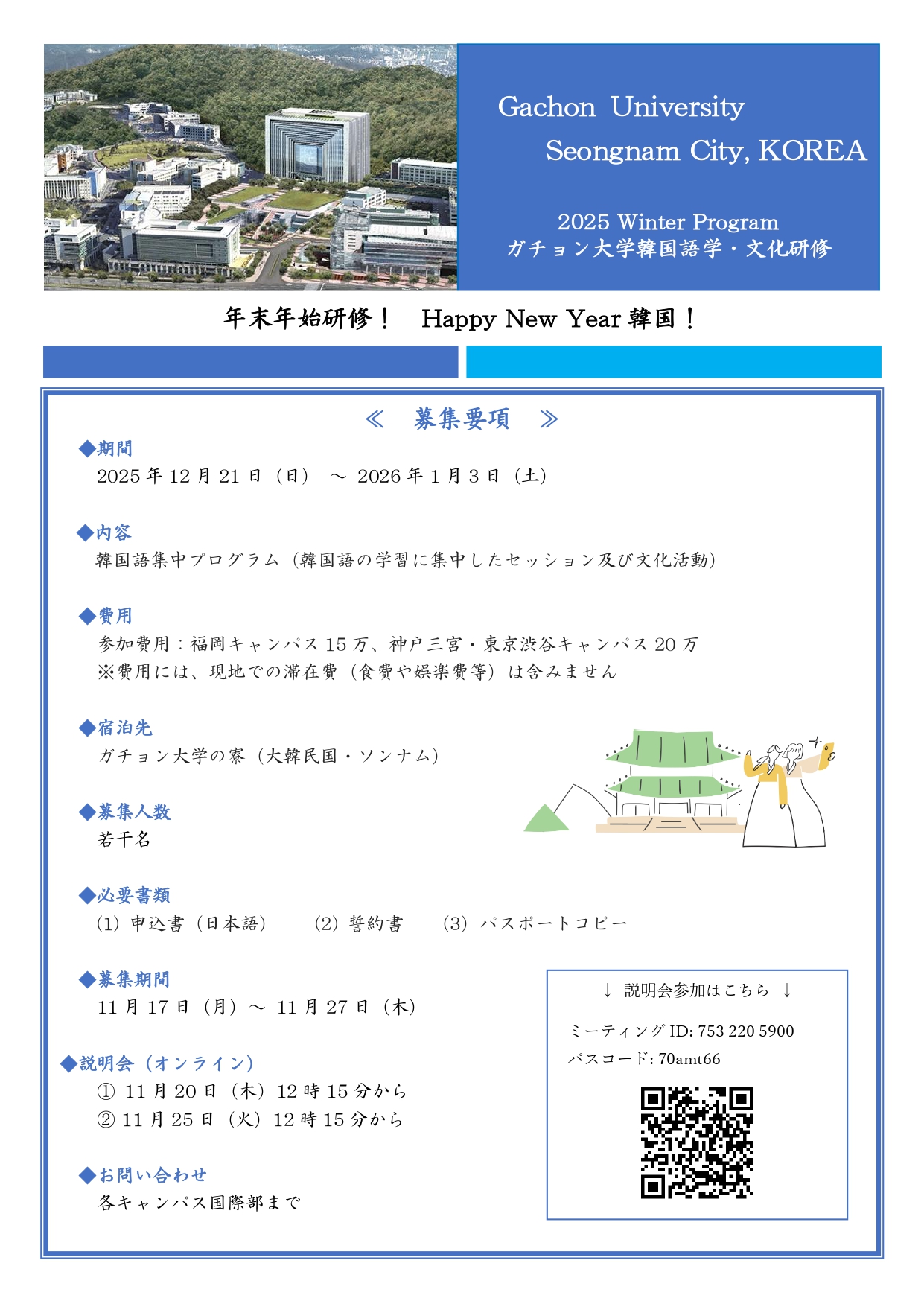 参加希望者はこちらの資料を確認のうえ、必ずオンライン説明会に参加してください。 ◆必要書類(オンライン説明会に参加後、応募するときに提出すること) ・申込書 ・誓約書 ・パスポートの顔写真・有効期限が載っているページのコピー ◆4年生の参加について 4年生でも参加は可能です。 ただし成績確定後の留学となりますので単位は付与されません。 <留学に関する問い合わせ先> 渋谷キャンパス国際部 03-3463-4143 / kokusaibu@tk.jue.ac.jp