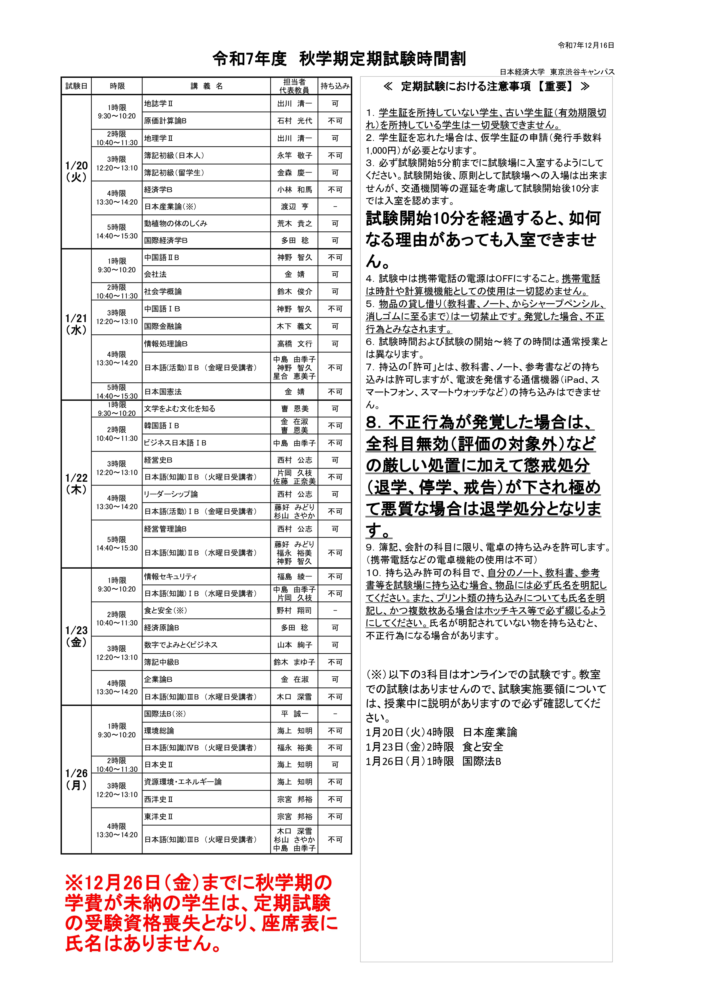 令和7年度 秋学期定期試験時間割についてお知らせします。 定期試験は、教室・座席が指定されますので指定された教室・座席に着席するようにしてください。 試験の教室は通常授業の教室と異なる場合がありますので間違えないように注意してください。 教室・座席については後日マリア館ロビーに掲示します。 PDFデータはコチラ