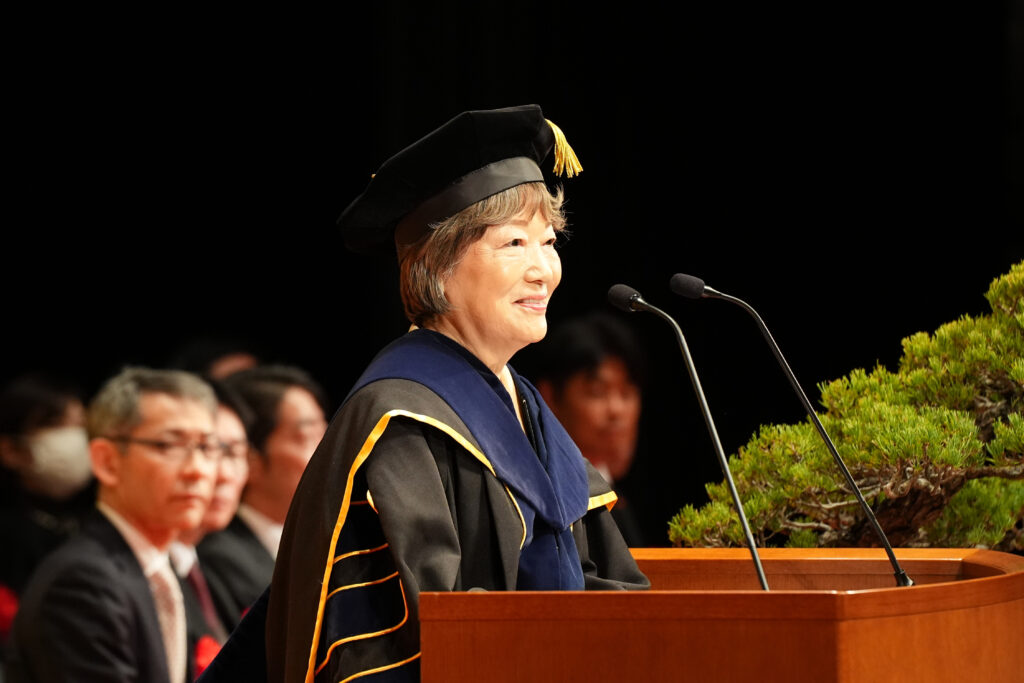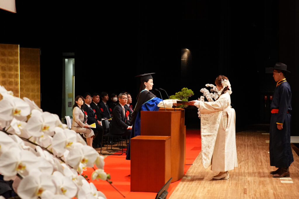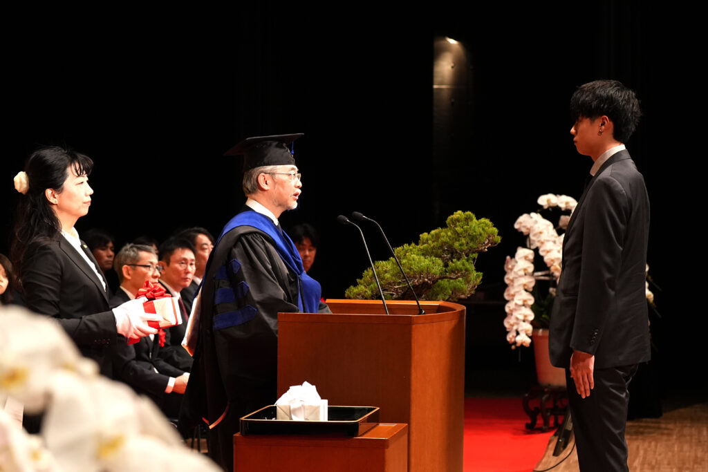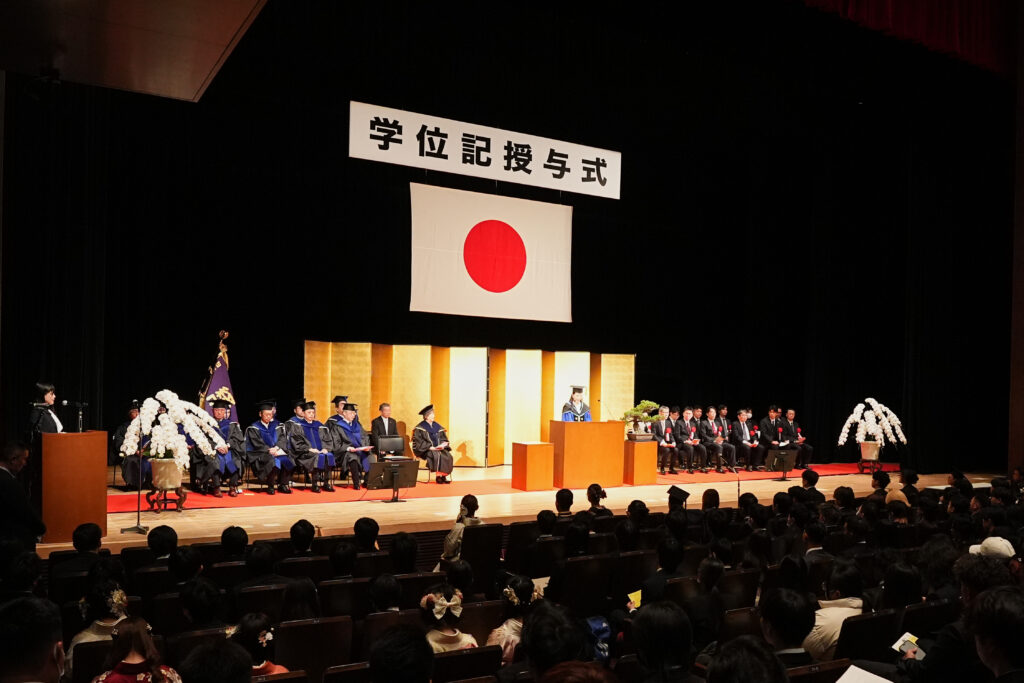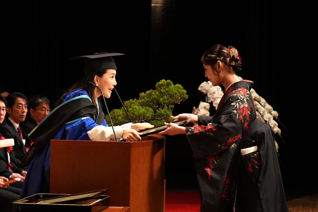 2026年3月12日、本学東京渋谷キャンパスにおいて、日本経済大学大学院と合同で「第13回 学位記授与式」を挙行いたしました。卒業生を代表し大山 ひなつさんが学位記を受け取り、在学生代表として芸創プロデュース学科2年 半山 紗来さんが送辞を、卒業生代表の澤 友由希さんが答辞を述べました。また、学生広報プロジェクトチーム「渋谷ブルーローズ」発足の中心を担い4年間にわたりリーダーとして活躍し、地域イベントへの参画などを通して文化・地域活性化に尽力した活動を称え、池上 心乃香さんが「社会貢献奨励賞」を授与されました。