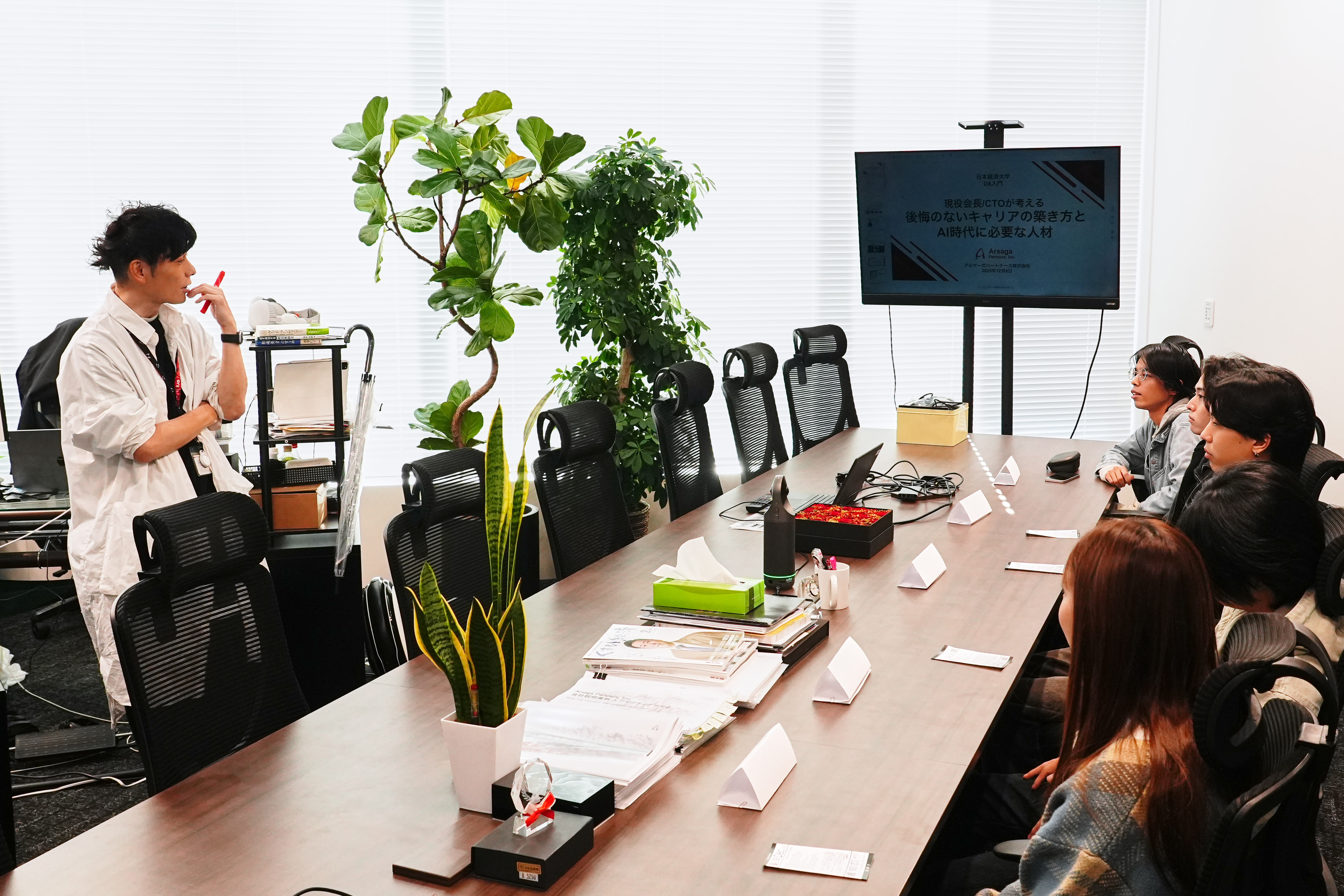 アルサーガパートナーズは「企業に競争力を 仲間と充実感を そして、新しい物語を」をビジョンに掲げる急成長企業です。今回は、ご自身もエンジニア出身でありながら経営者として手腕を振るう小俣氏に、AI時代における「仕事観」や「キャリア形成」について、非常に熱いお話を伺いました。その様子と、学生たちの反応をご紹介します。