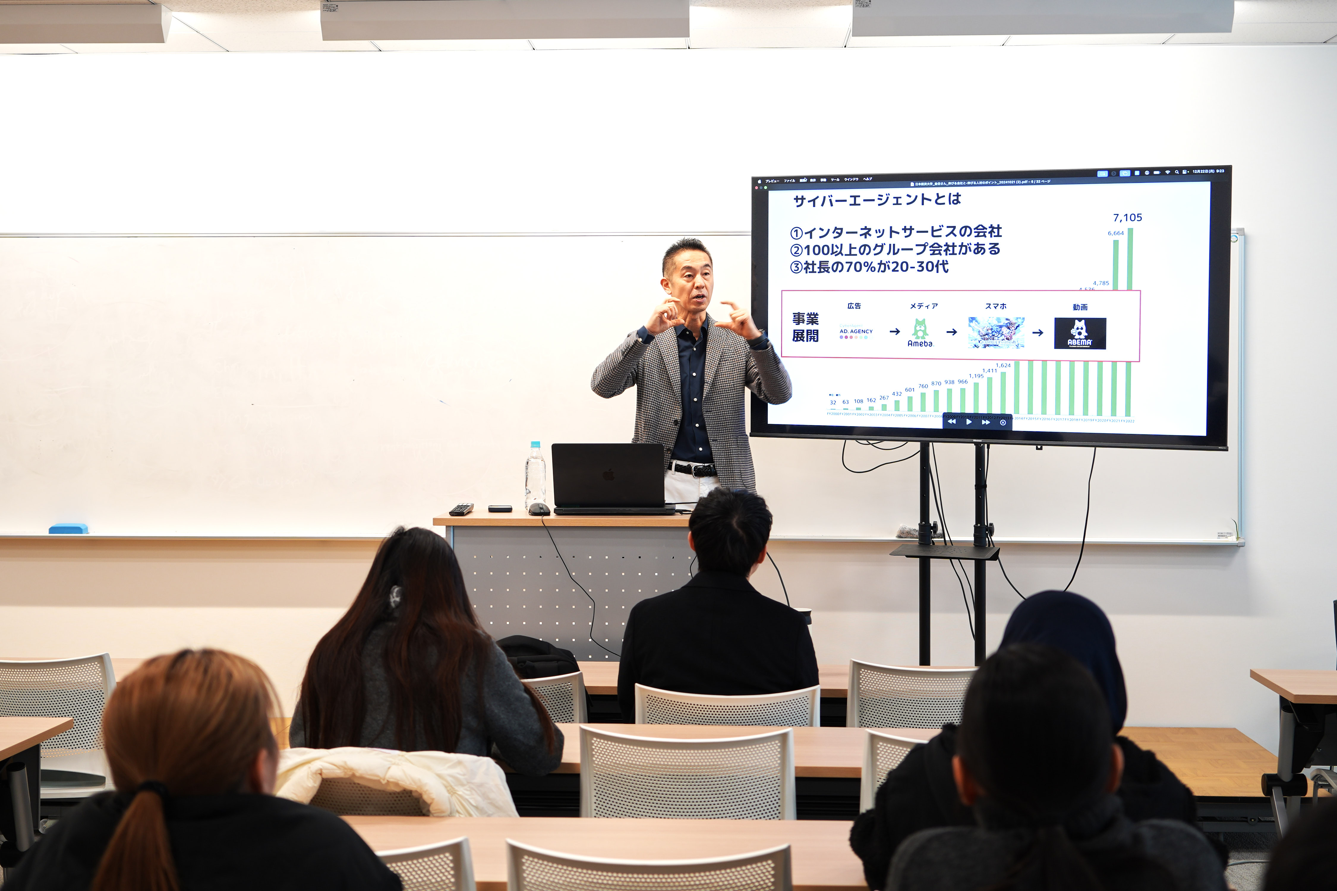 昨年12月、株式会社サイバーエージェントで常務執行役員CHO(最高人事責任者)を務める曽山哲人氏をSakura Stageにある日本経済大学STATIOにお招きし、特別講義を行っていただきました。テーマは昨年に引き続き「成長する人材と伸びる会社」。今年も1年生を対象にお話しいただきました。